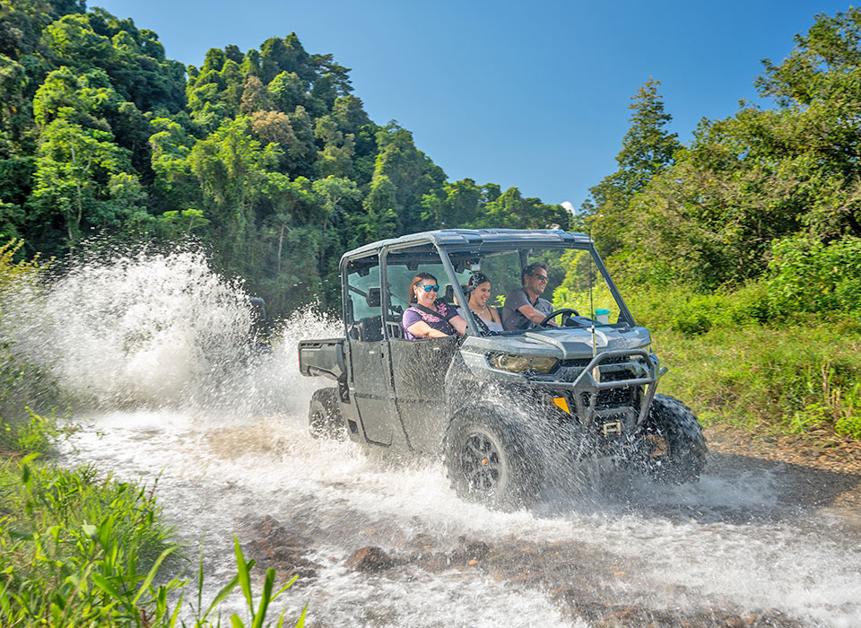 This is a full day tour, with transfers to and from Port Douglas. It includes all the amazing action of the Cassowary Falls tour, with its thrilling driver / guide UTV (4WD) rides splashing across creeks and rivers, Army Truck rides and a 1 hour Daintree River Wildlife Cruise and light lunch by the Daintree River. Pick-ups start in Port Douglas from 8.15am and you will be back in Port Douglas from 3.30pm – 4pm. Please provide your own drinks & food for any infants. We require a minimum of 2 Adult guests to operate this tour.